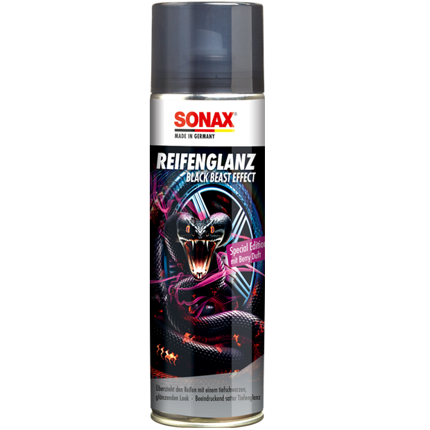 Produces a perfect, deep black glossy finish in no time! No more cracking, premature ageing and fading. The rubber is maintained and protected with regular use. The shiny look covers the tyre for several weeks. Super easy to apply: spray on, allow to work in, done! Suitable for all types of tyres. With a fruity berry fragrance.
